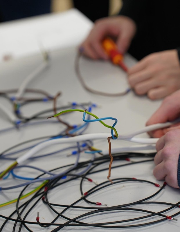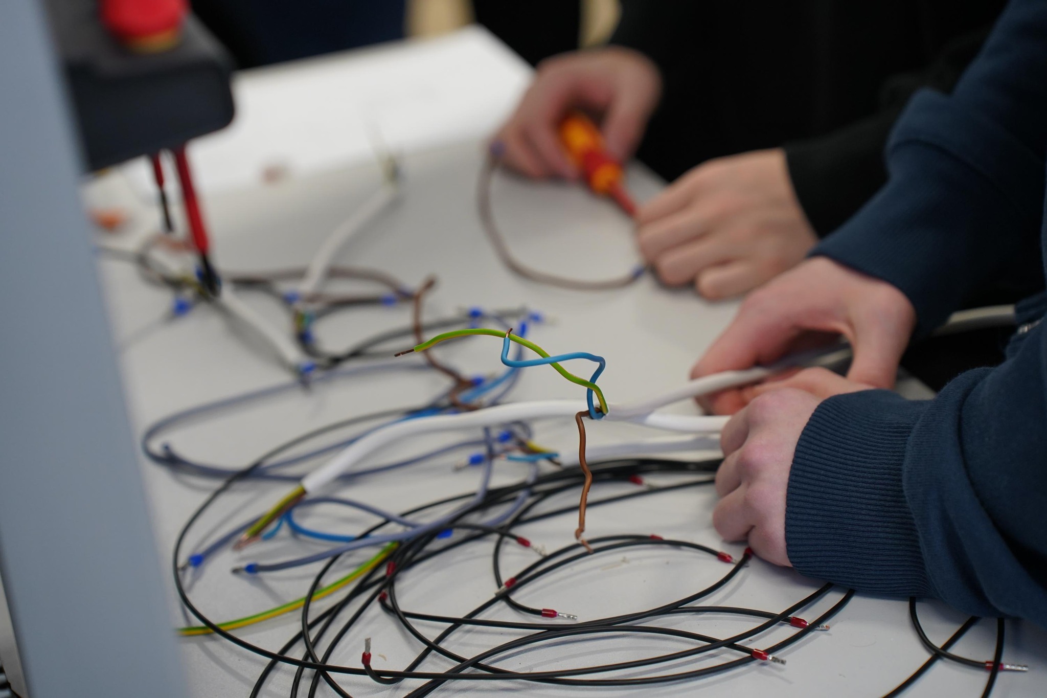 Elektrotechnikos kabinete mokiniai susipažino su naudojama įranga ir įvairiais stendais, kurių padedami mokėsi jungti elektros imtuvus skirtingais tarpusavio jungimo būdais, taip pat praktiškai tikrindami nuoseklaus ir lygiagretaus jungimo dėsningumus.
