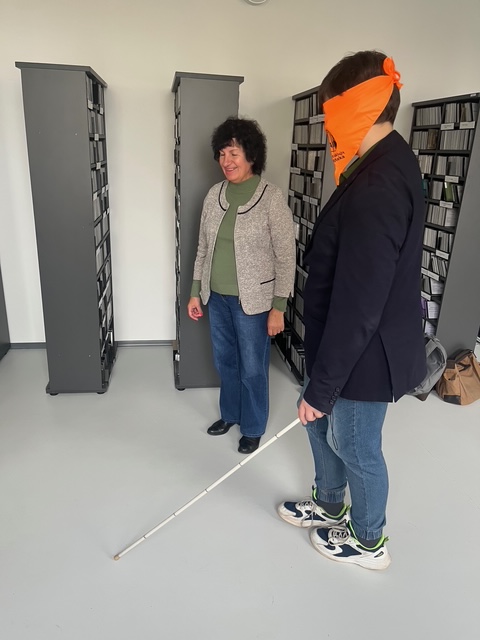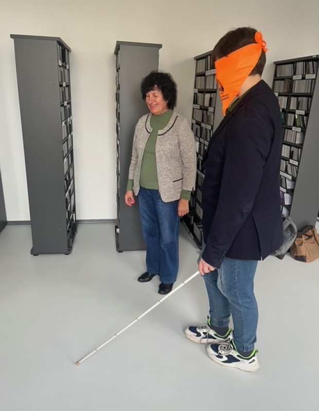 Vaikščiodami užrištomis akimis moksleiviai patyrė, kaip sudėtinga neregint orientuotis aplinkoje. Edukatorė pristatė specialią įrangą, kuria naudojasi neregiai ir silpnaregiai, garsines knygas, ELVIS virtualią biblioteką, skirtą žmonėms, negalintiems skaityti įprastai spausdinto teksto ir diskutavo su mokiniais apie bendravimo su žmonėmis, turinčiais negalią, kultūrą.
